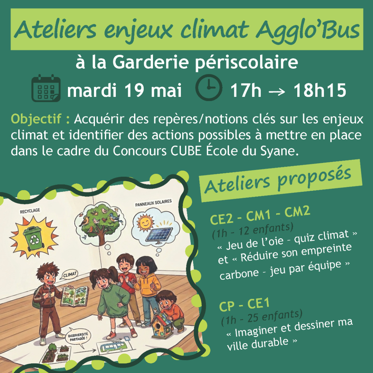 L’objectif des ateliers Agglo’BUS ? Aider les enfants à acquérir des repères et notions clés sur les enjeux climat pour identifier des actions possibles à mettre en place.